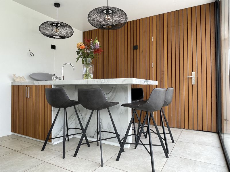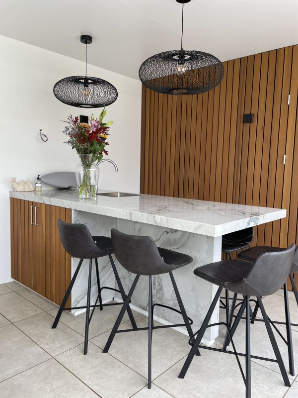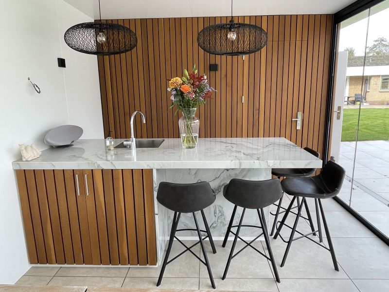 Voor onze opdrachtgever mochten we een stijlvol poolhouse inrichten - met warme houtaccenten, een natuurstenen blad en een tijdloze afwerking.